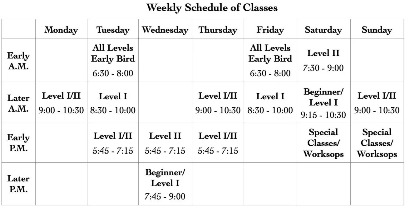 You may attend any class at the same level, one level above, or one level below. You cannot make-up missed classes in future sessions or special classes.